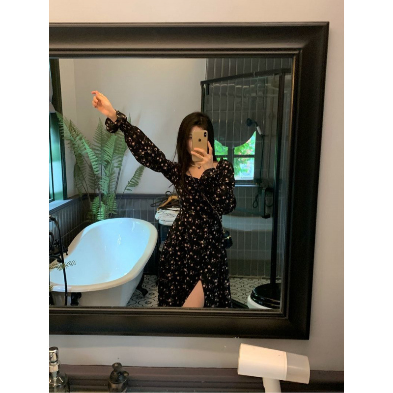 大きいサイズの太った花のワンピースの女性の秋の服の2024新型のフランス式のお茶の休みのスカートの高級感の長袖のオープンスカート