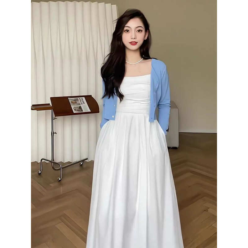 白いストラップのワンピースの子供は2024年の春夏の新型のキキョウのフランスの気質の高級感のロングスカートの2つのセットです。