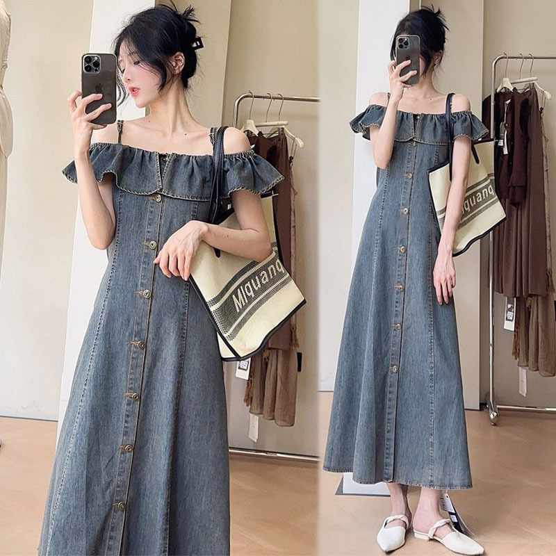 フレンチレトロフリルエッジ一字肩ブルーデニムワンピース洋気おしゃれ高级感ストラップロングスカートレディース夏