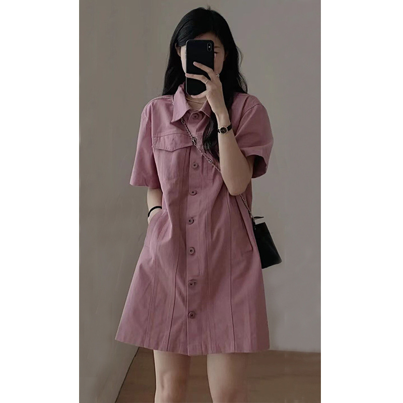 夏のピンクのワンピースの女性2024の新型の韓国系のシンプルなファッションは腰の襟の半袖のシャツのスカートのスカートを収めます。