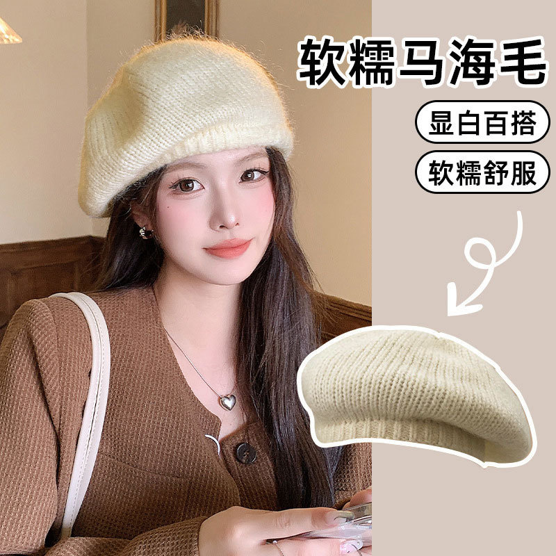 韓国ins同モデル馬海毛ニットベレー帽女性秋冬ファッション百合画家帽大頭囲顔小