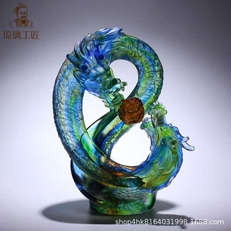 瑠璃双龍戯珠生肖置物風水オフィス会社客間店舗開業贈答工芸品高級