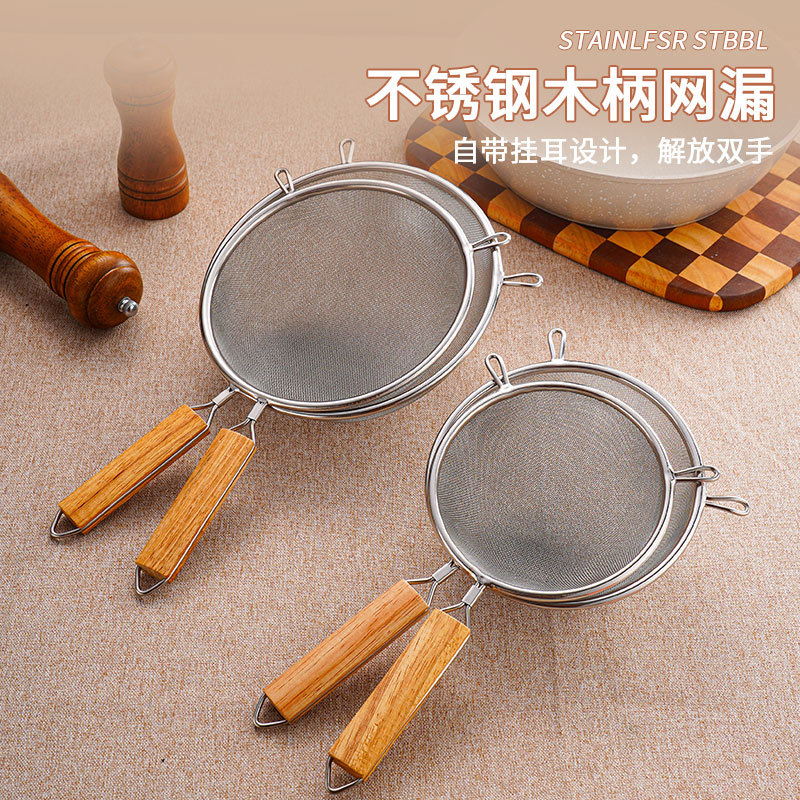 両耳ステンレス網漏れ超密網油漏れスプーン木柄粉篩ろ過網漏れスプーン家庭用ホテルキッチン線漏れ