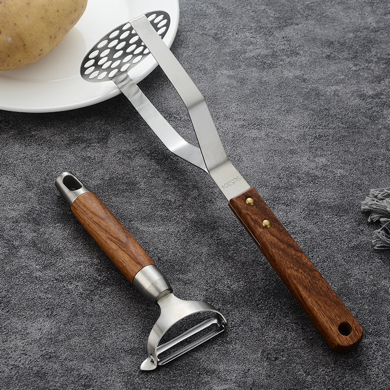 木製ハンドルステンレス鋼ポテトプレスキッチンマッシャーフルーツピーリングナイフマッシャーキッチンガジェットメロンピーラー