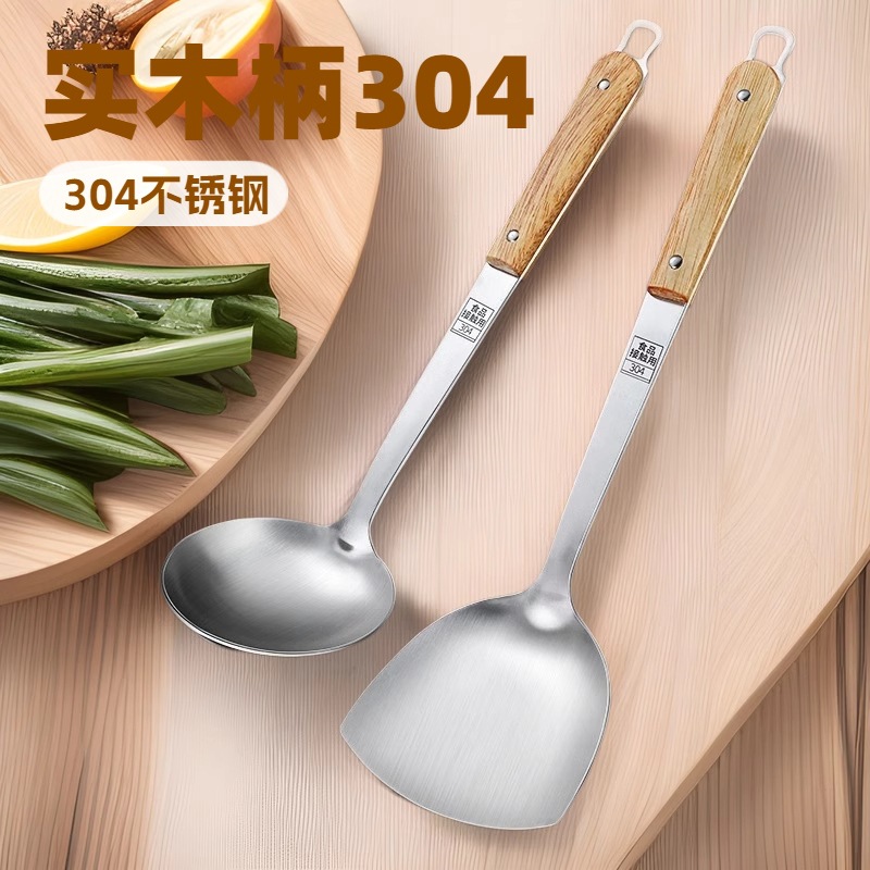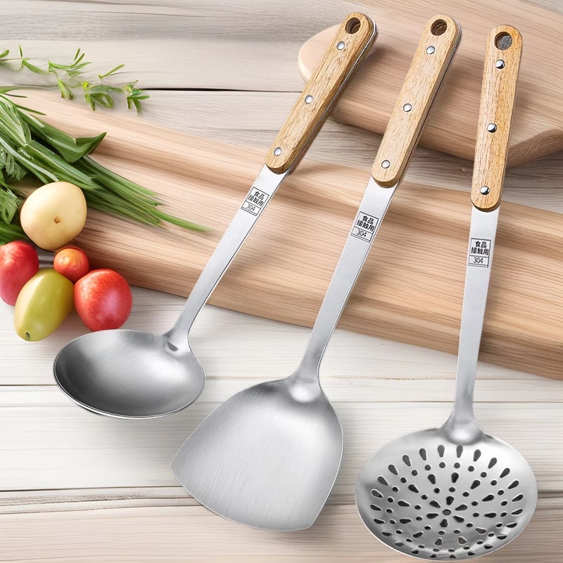 304ステンレス鋼の鍋用スパチュラ、木製ハンドルの炒め物用スパチュラ、家庭用のお粥用スプーン、料理用スパチュラ、調理用スプーン、ザル、スープ用スプーン、魚用スパチュラ