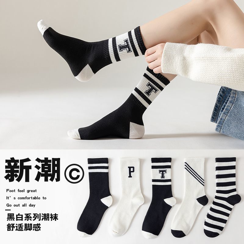 虹の靴下の女性の春と秋冬の中筒のファッションの靴下の街頭のストライプのスポーツの靴下の日本の綿の靴下の通気性の白黒の卸売り