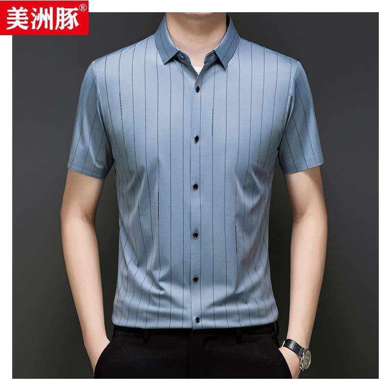 2025夏の新型高級氷糸無痕半袖シャツ男のお父さんはストライプのサイズの服を着ています。中年男性半袖です。