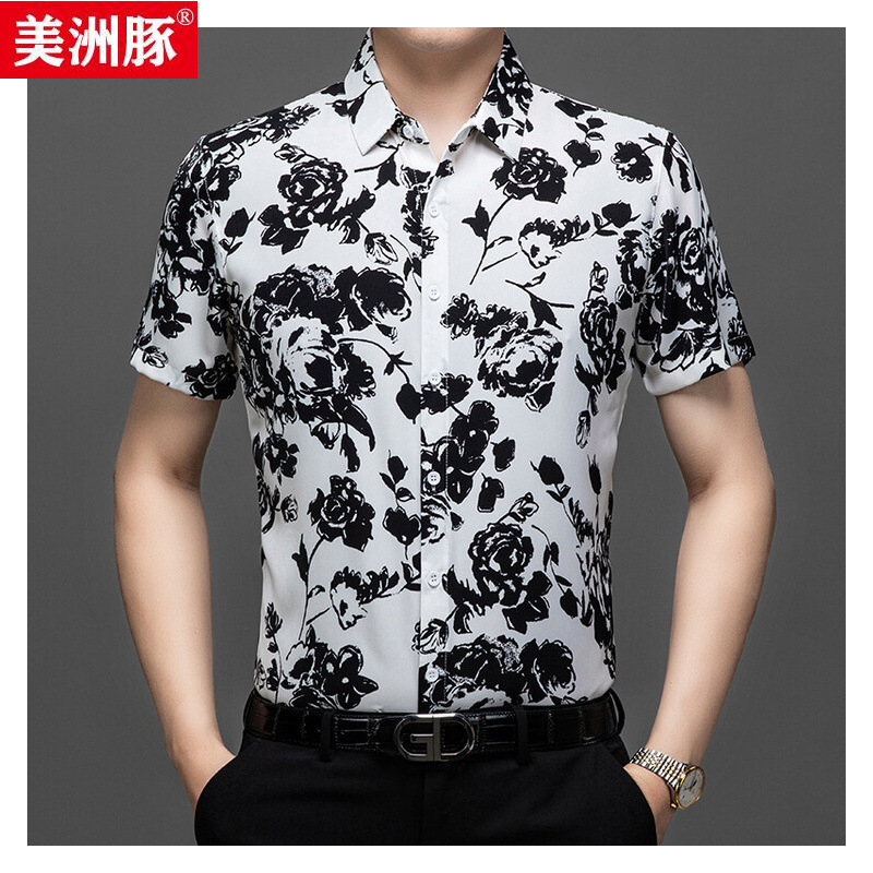アイスシルク半袖プリントシャツ、中高年男性向け、ゆったりトレンドお父さん着用クールシャツ、花柄トップス、紳士服