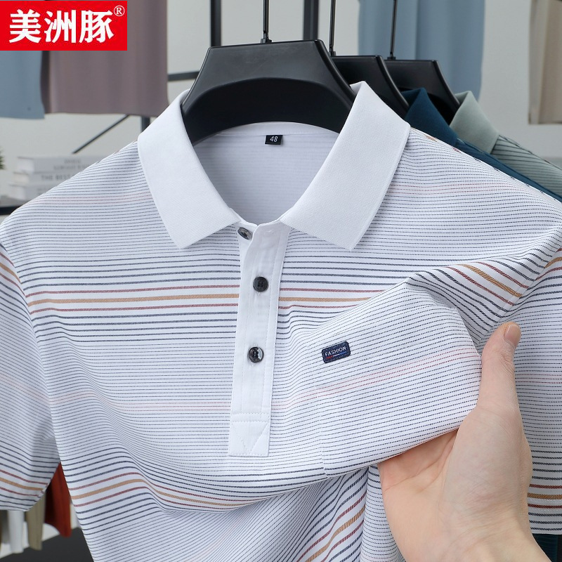 ハイエンドの夏の半袖 T シャツメンズラペルコットンストライプポロシャツ若者と中年の父親のためのリアルポケット T シャツメンズシャツ