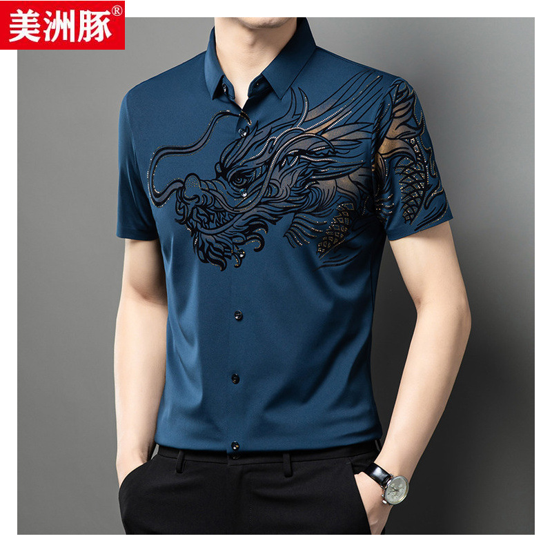 新しいハイエンド夏のアイスシルクシャツメンズリッチバンブープリント若者と中年男性カジュアルシームレスシャツ半袖