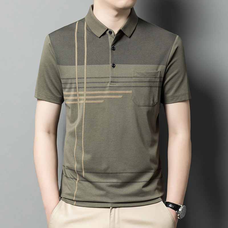 夏の新型男性折り襟半袖tシャツ中青年男性ストライプ真ポケット上着半袖カジュアル紳士服ショート