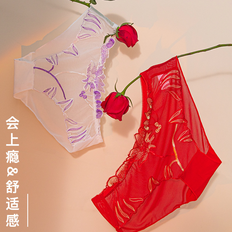 高颜値赤色刺繍レースパンツ低腰透かしセクシー半透明誘惑無痕純欲風三角パンツ